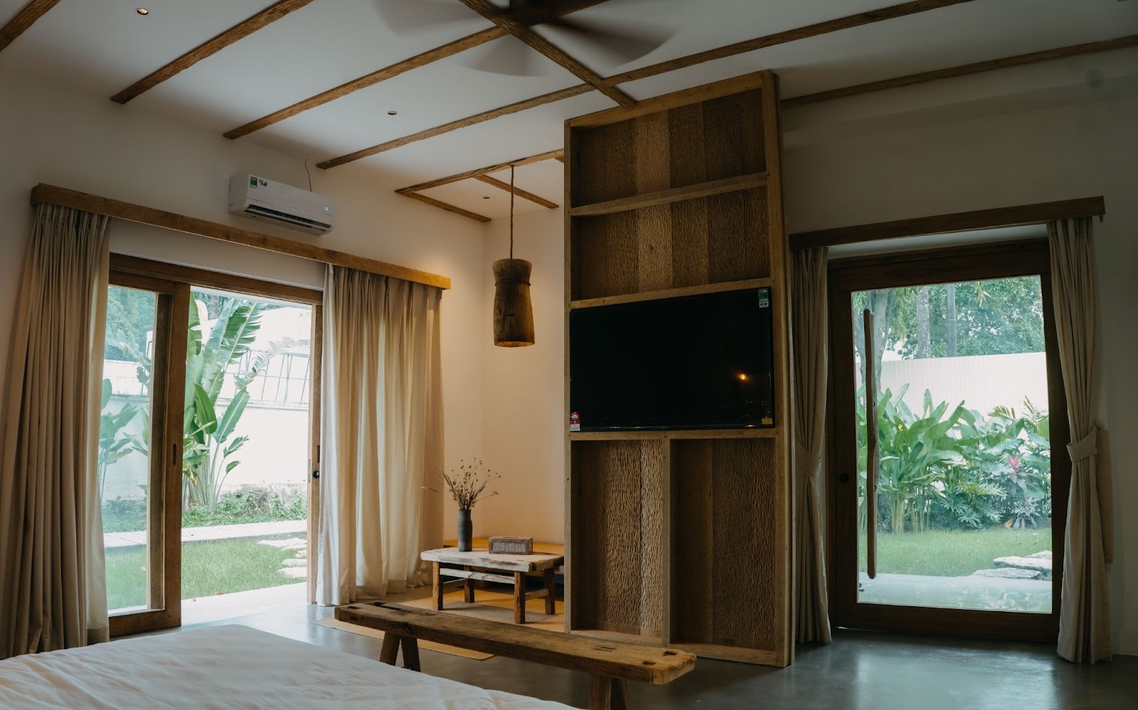 Private Garden Room được xem là “viên ngọc ẩn” của Ecolodge – chỉ có duy nhất 1 phòng và nằm tách nhẹ khỏi cụm phòng còn lại, mang lại sự riêng tư tuyệt đối. Phòng có cửa kính lớn hướng thẳng ra vườn, giúp ánh nắng tràn vào mỗi sáng và tạo cảm giác mở rộng không gian.