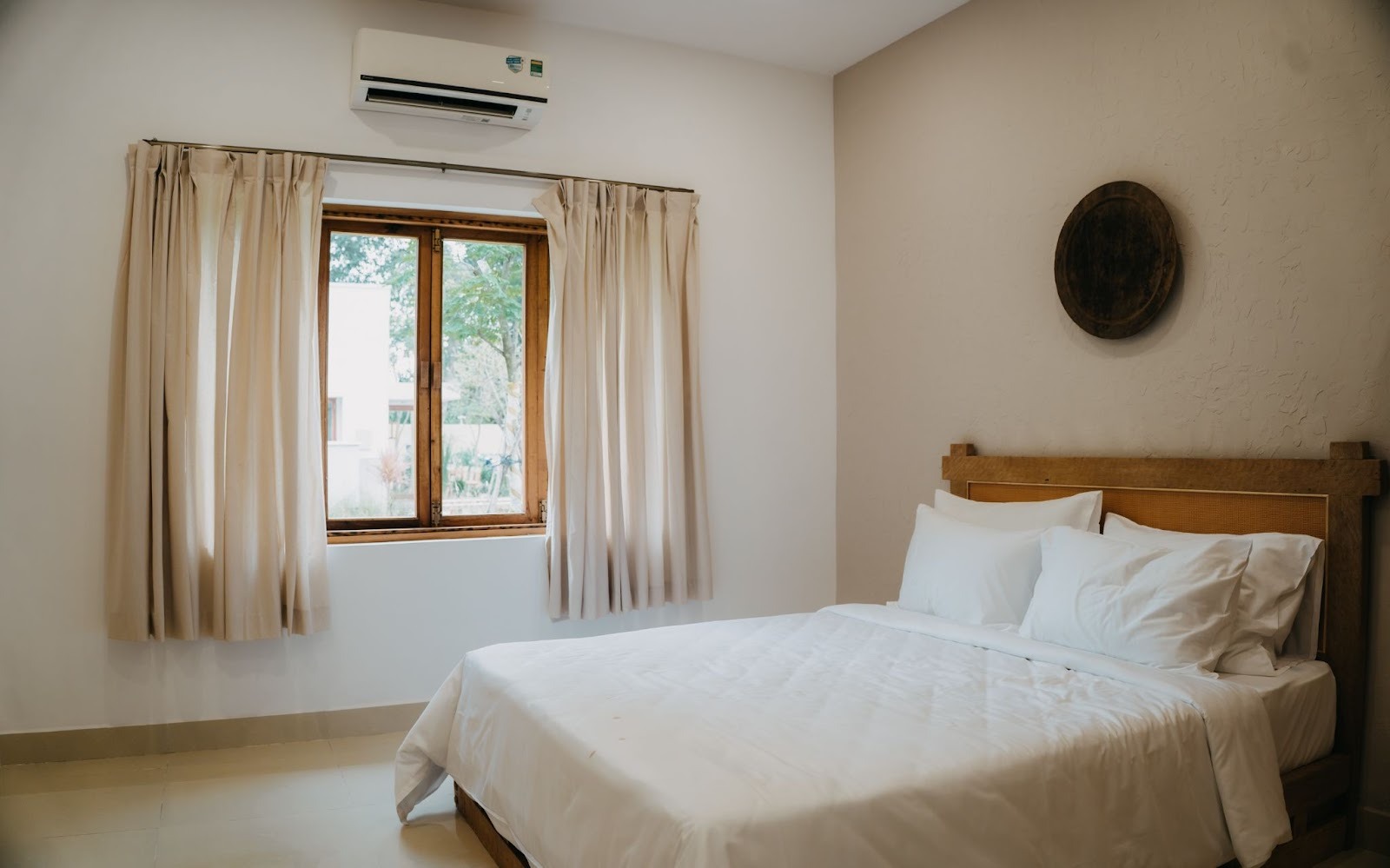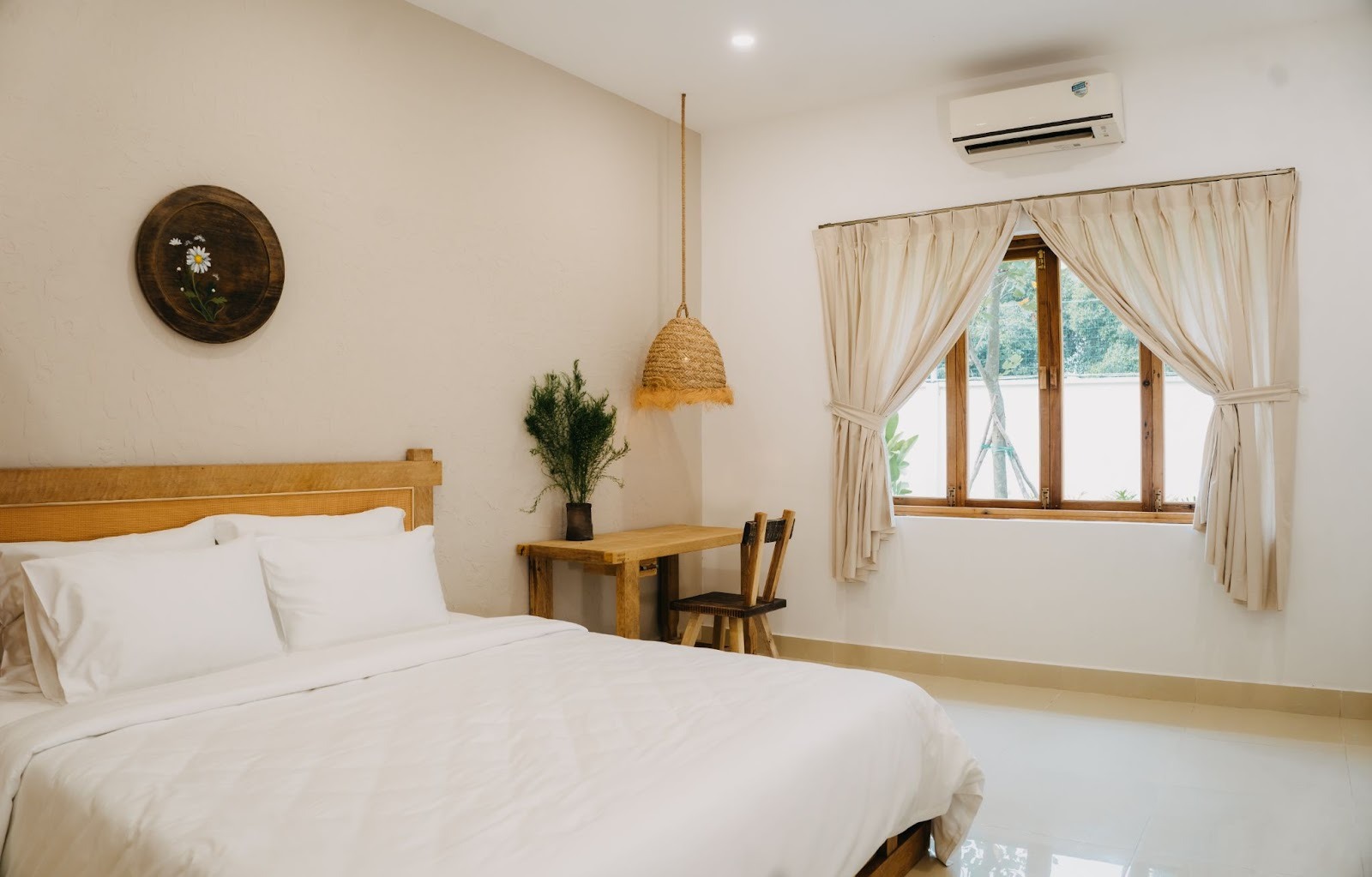 Phòng được sắp xếp gọn gàng với nội thất tinh giản vừa đủ, không thừa chi tiết nhưng vẫn đầy đủ tiện nghi. Cửa sổ lớn giúp lấy sáng tốt, kết hợp rèm linen mềm rũ tạo cảm giác dễ chịu, rất phù hợp để đón nắng sớm hoặc nhìn ra không gian xanh bên ngoài. Giường êm ái, drap sạch, ánh đèn vàng ấm được bố trí vừa phải, mang lại bầu không khí thư giãn, thích hợp cho những buổi tối nghỉ ngơi sau một ngày dài.