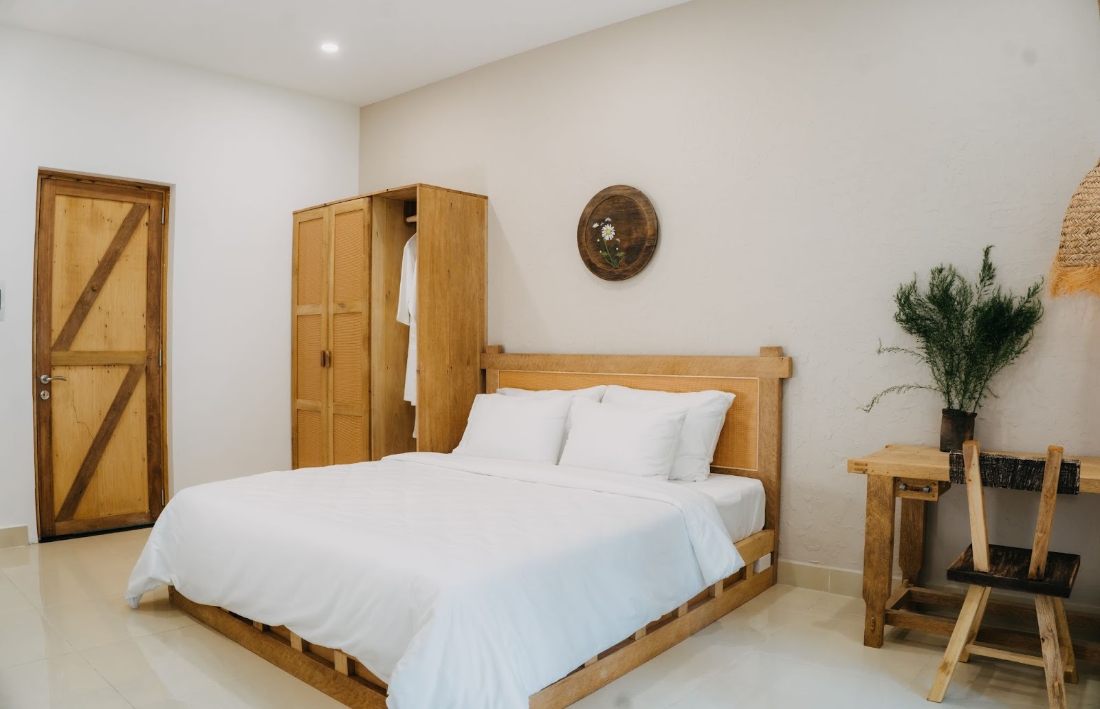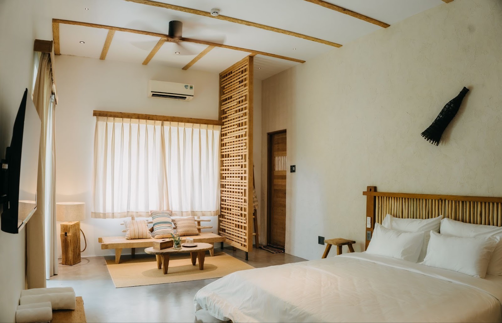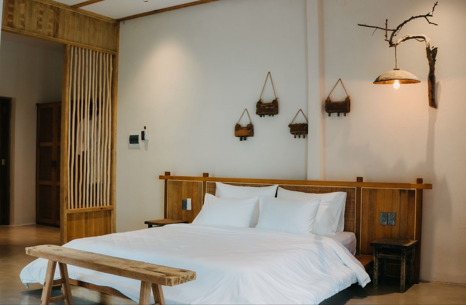 Tone phòng ấm, nhẹ và mộc; nội thất chủ yếu là gỗ thô kết hợp những món decor bằng mây tre, bình gốm, bàn trà nhỏ – tất cả tạo ra bầu không khí dễ chịu đến mức chỉ cần bước vào là muốn thả lỏng.