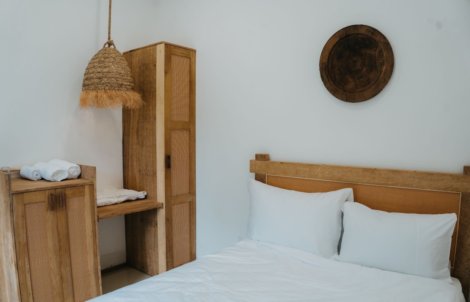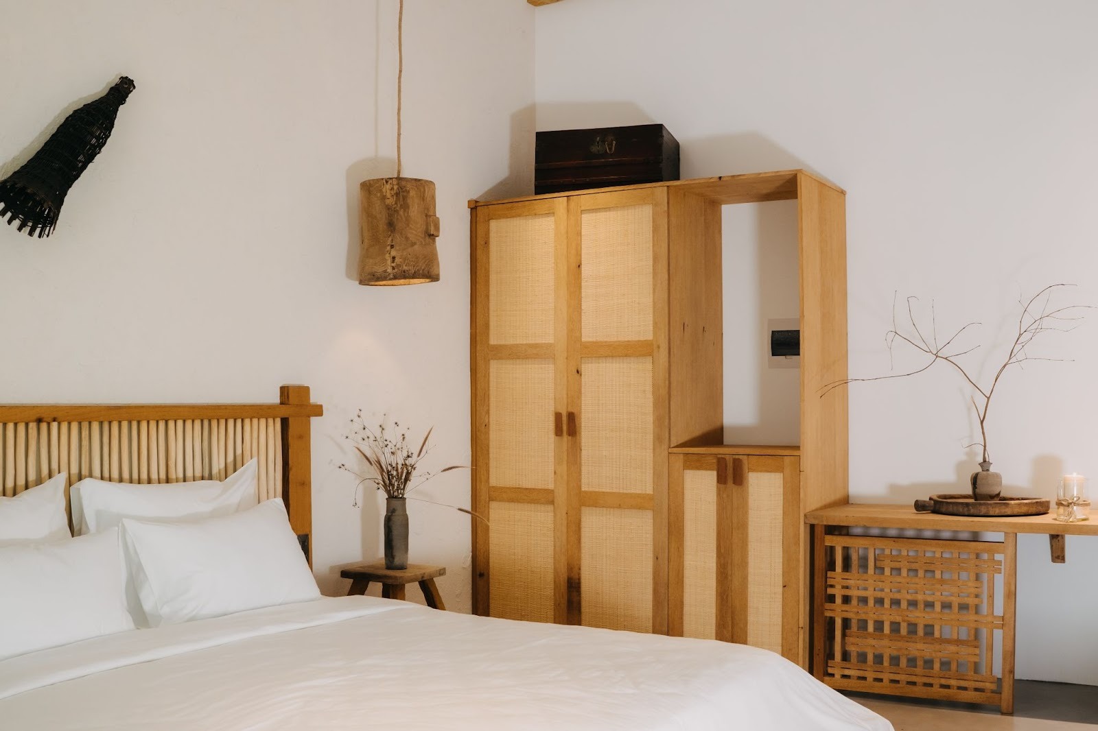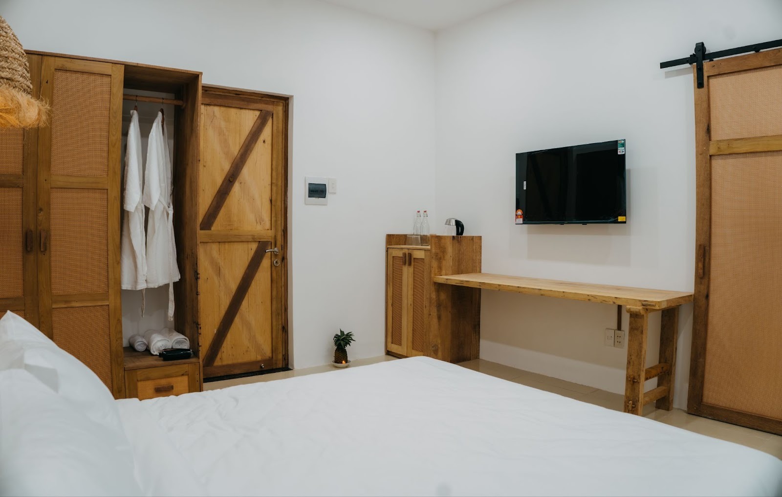 Tone phòng ấm, nhẹ và mộc; nội thất chủ yếu là gỗ thô kết hợp những món decor bằng mây tre, bình gốm, bàn trà nhỏ – tất cả tạo ra bầu không khí dễ chịu đến mức chỉ cần bước vào là muốn thả lỏng.